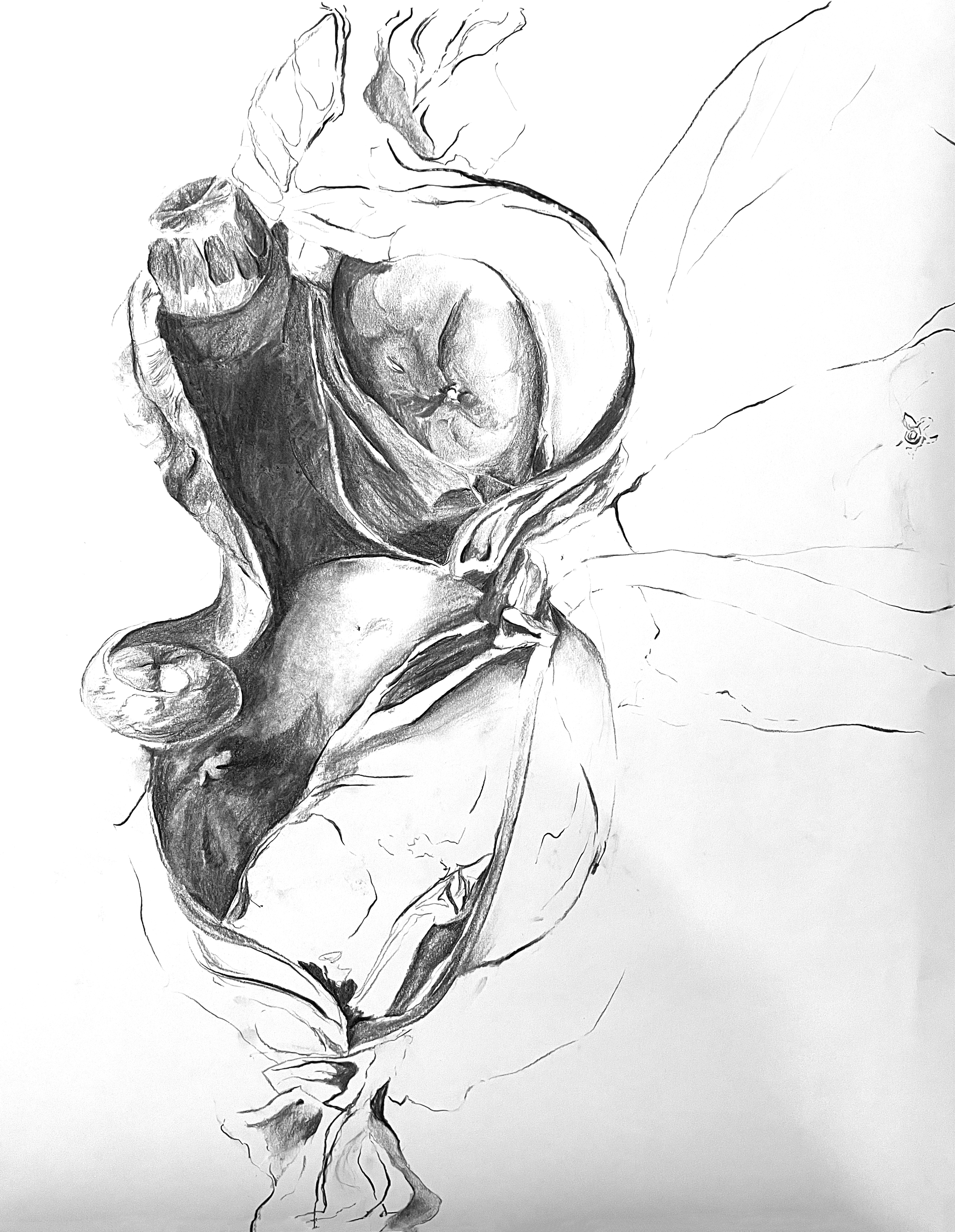 Studies of John Peto’s still life paintings wrapped oranges, on the recommendation of Professor Sue Ferguson Gussow. The juxtaposition of the rough orange skin with the bright sharp paper allows for a study of the deep darks encompassed in each plane change, fold, and nook.