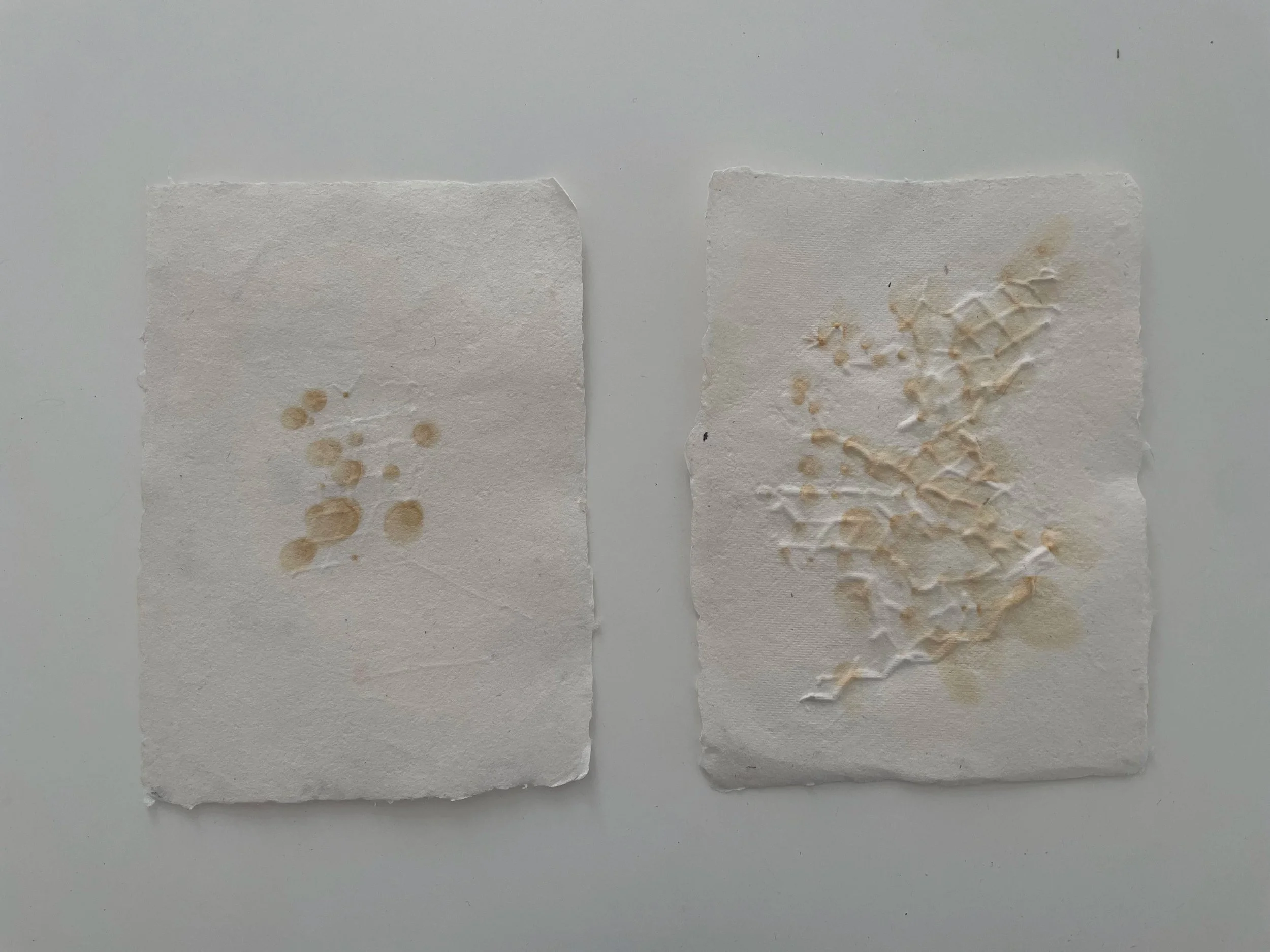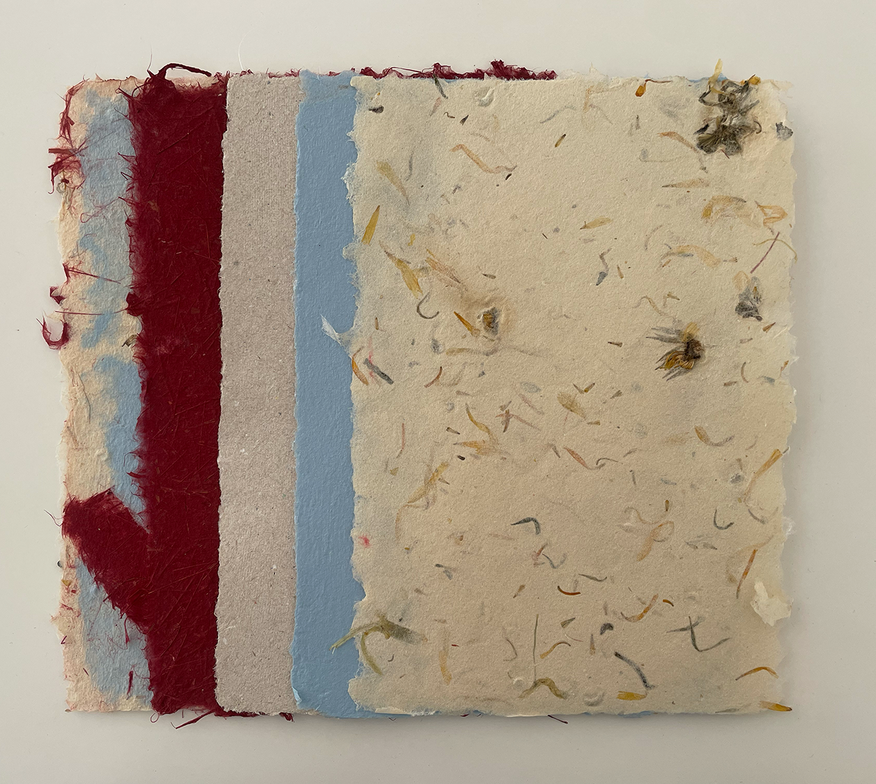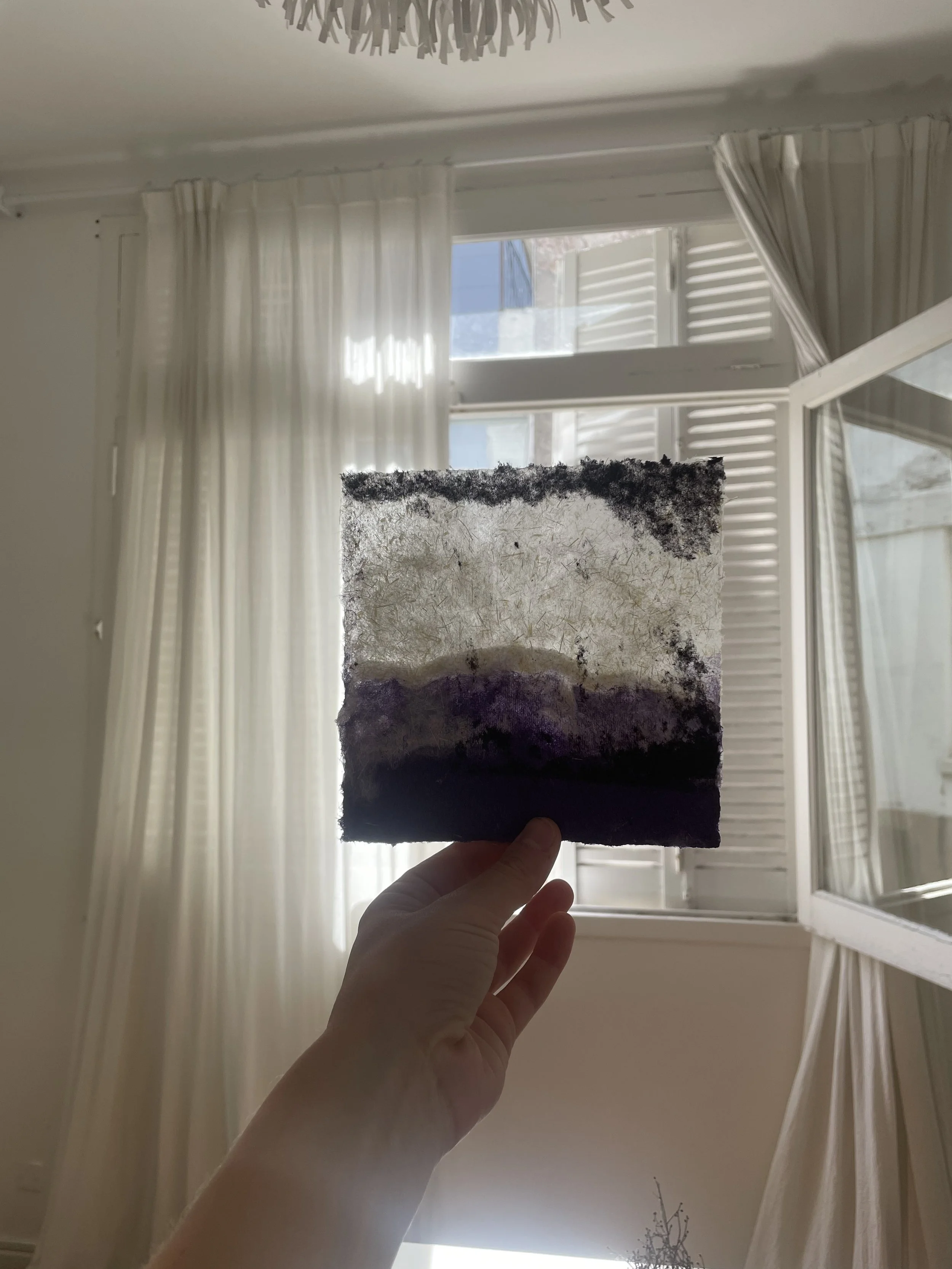 Trabajando con una variedad de materiales, bateas, colores, y texturas uno aprende a manipular las mezclas. Cada fibra tiene su propio espesor, una relación temporal basada en su habilidad de retener agua. Requiere paciencia dejar asentarse la batea, cambiando de un estado casi liquido, a un solido. Y cada solido tendrá su propias calidades; opacidad, fragmento, suavidad. Cada movimiento del cedazo puede causar doblaje y acumulación de fibra tal como puede crear campos de fibras finÃsimas.