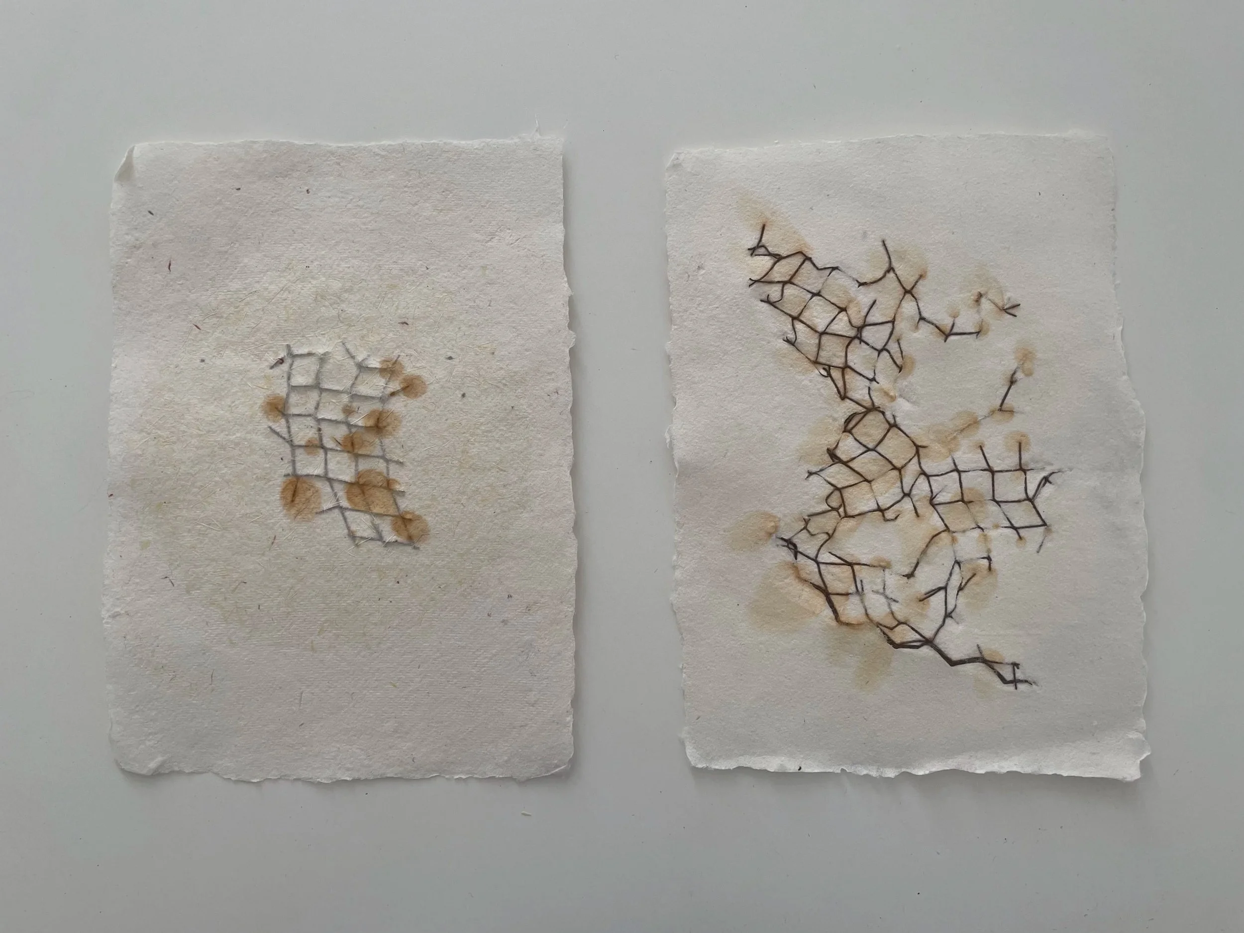Aprendiendo la practica de gofrado usando alambres recuperados de obras, apareció una hermosa reacción entre agua y el metal ya oxidado, pintando el algodón en tonos e impresiones de fuego.