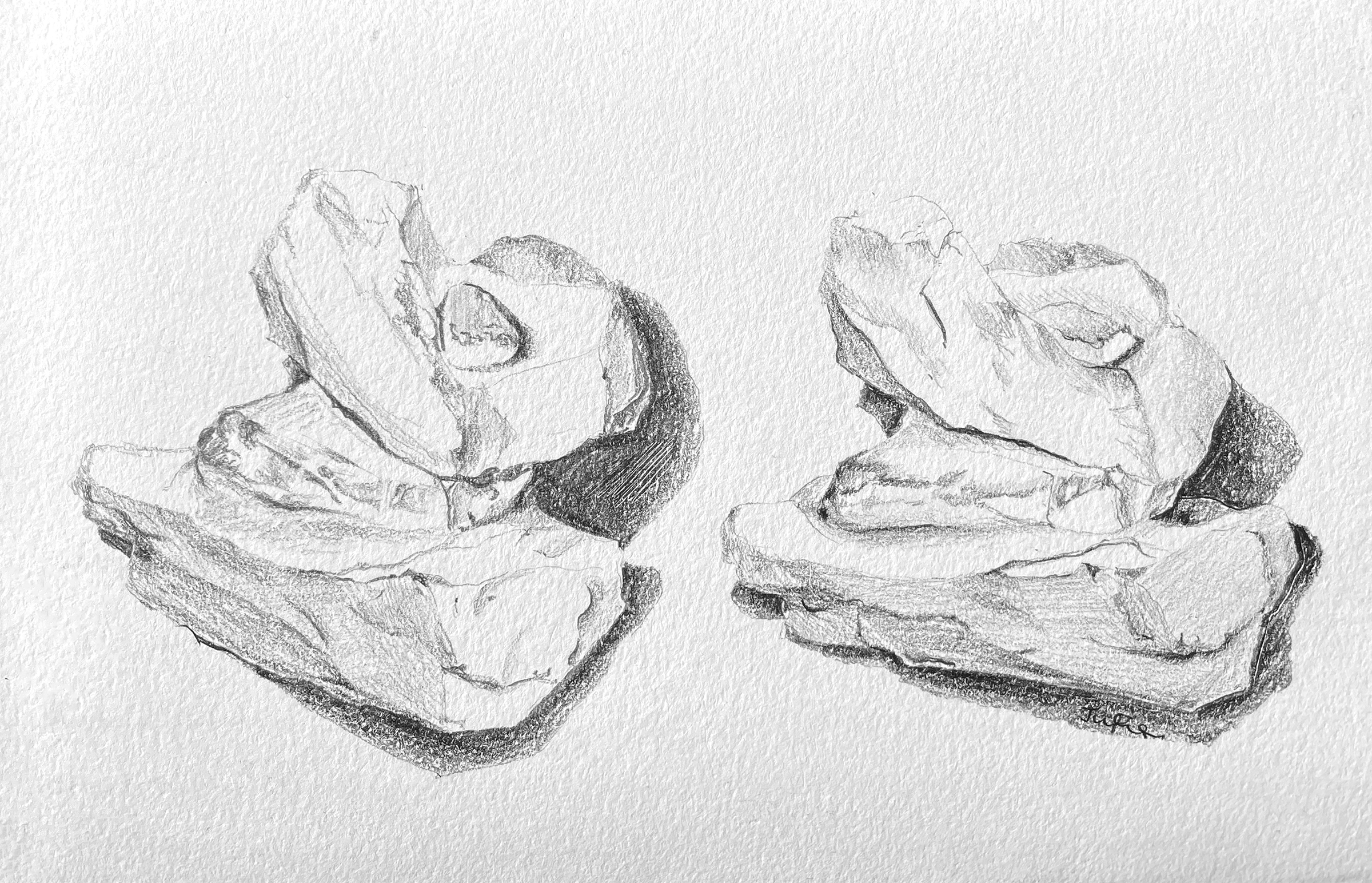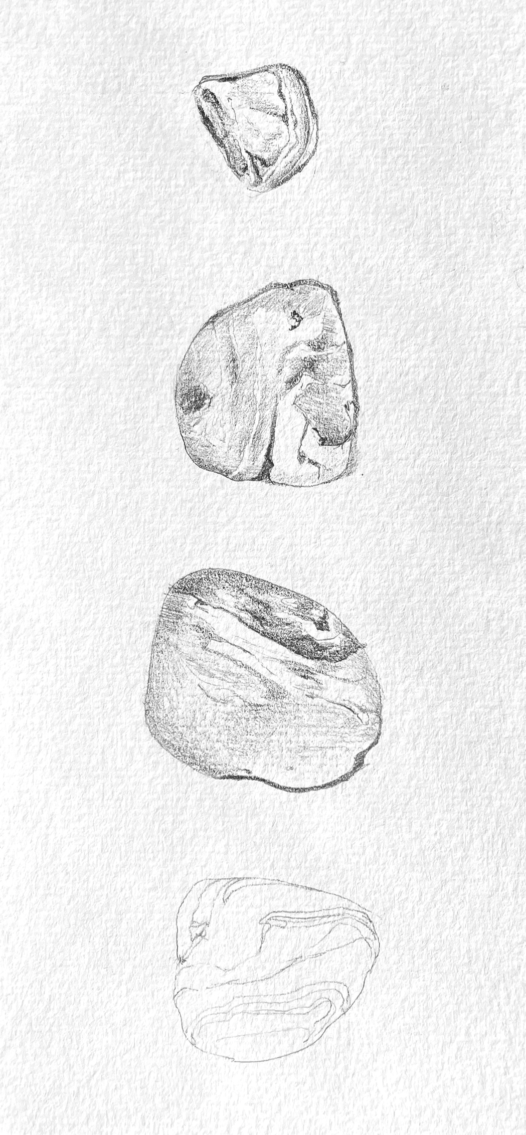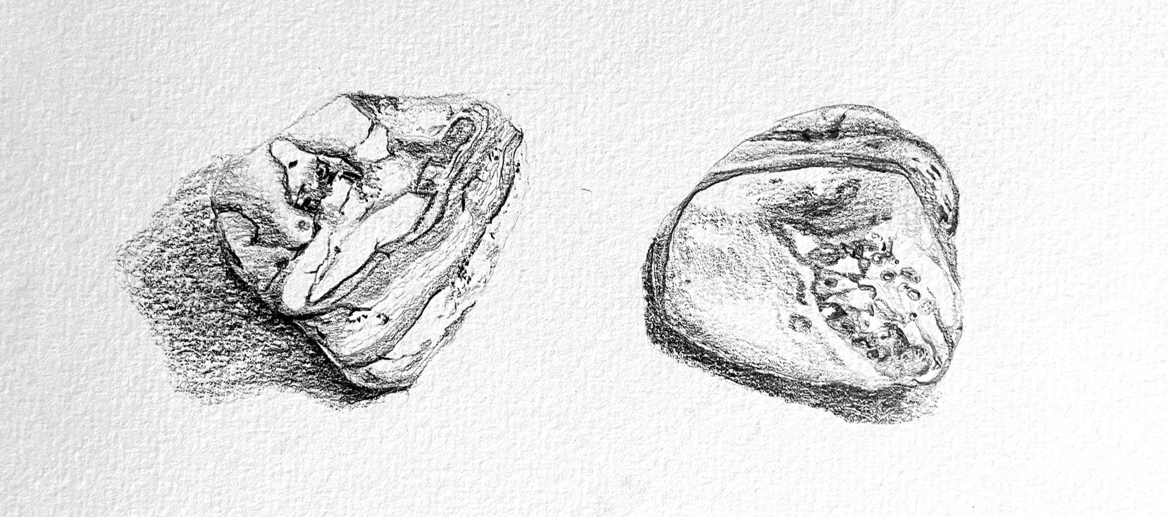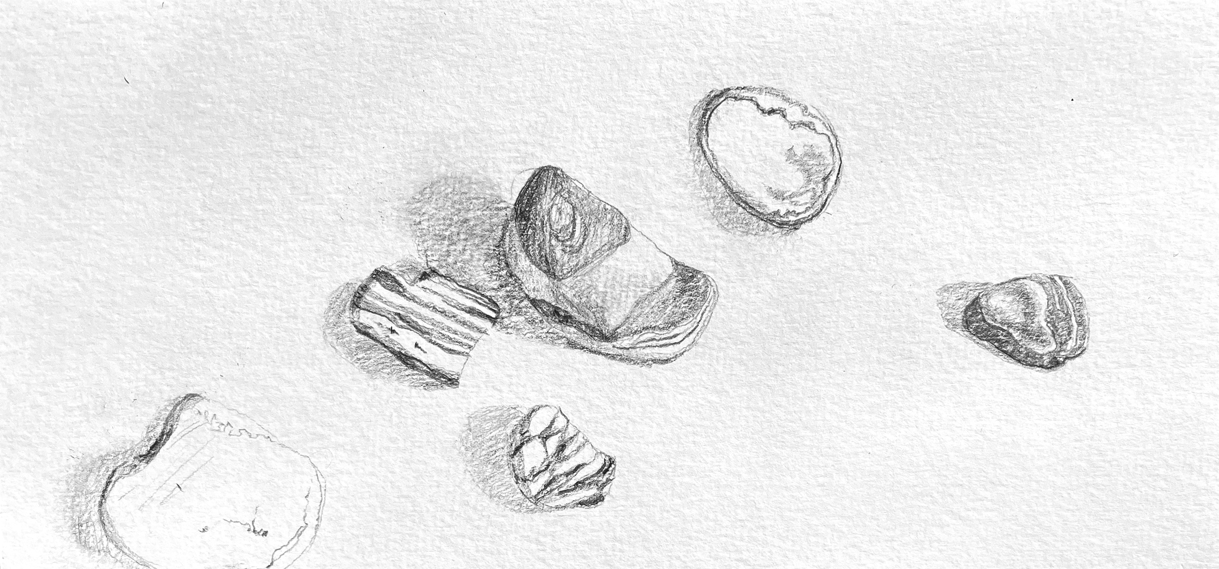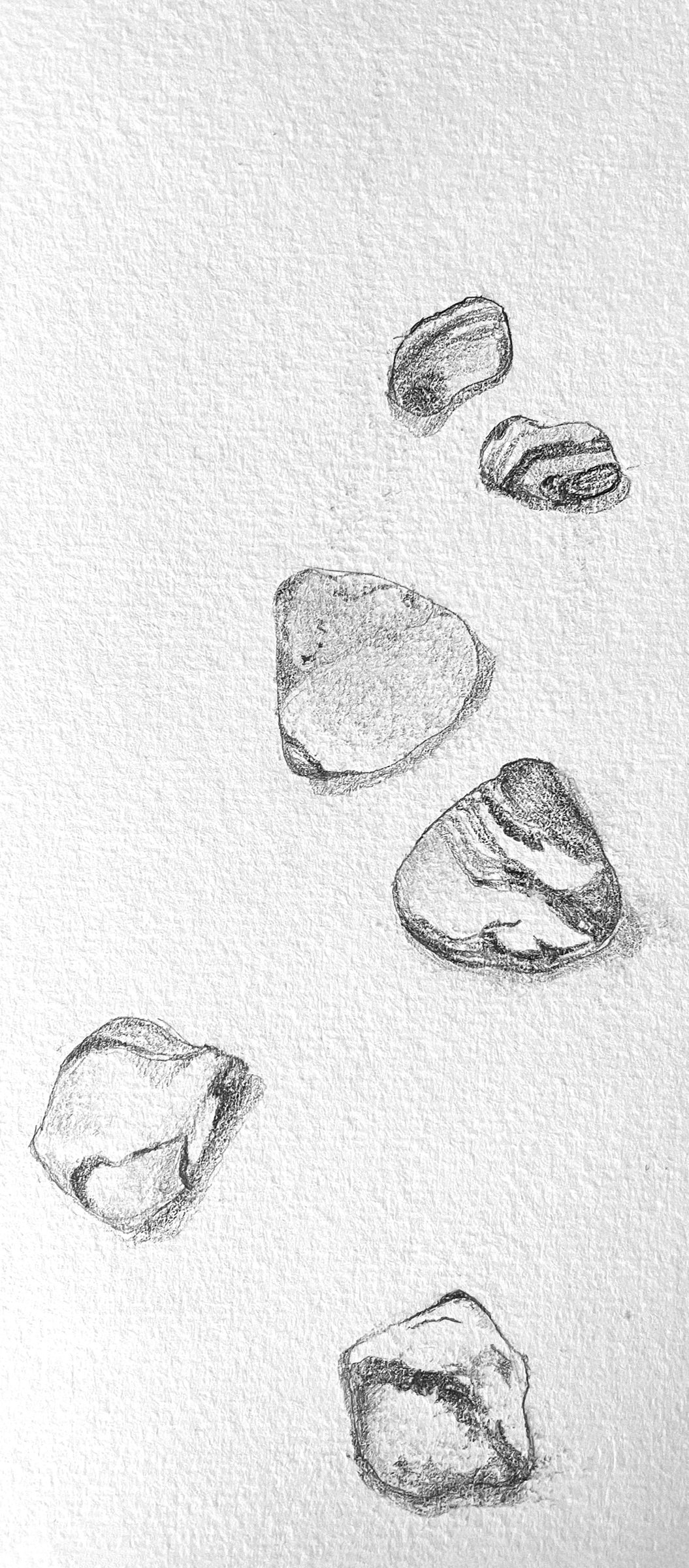 Upon spending the summer of 2025 in Glacier National Park, a place where mountains laid their tails into the east facing prairies and where the big sky spread in a vast blue dome, I found myself most enamored with what I found right at my fingers and toes. From flowers, mosses, and grasses growing right alongside the trails, to stromatolites popping up like ancient graveyards in the hanging valleys, and to the colorful, twisting and folded pebbles that dappled the shores of Lake McDonald, everything underfoot became a friend I wanted to get to know. What better way than to draw their portraits, giving them life in the intimate process of documenting their tones, creases, and dressings.